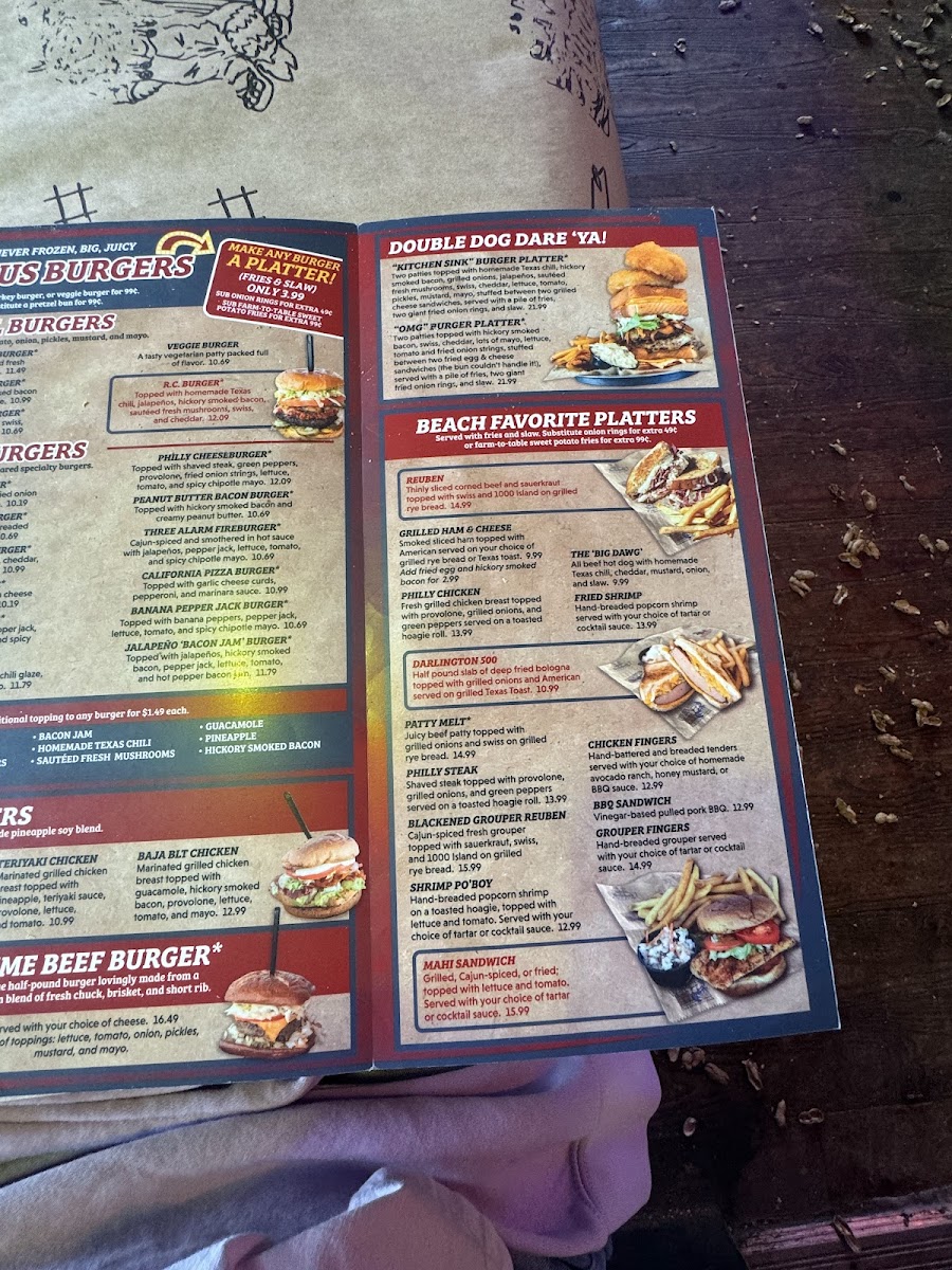 Huge burger made from two 114 lb beef patties smashed with crumbled hickory smoked bacon, topped with American, lettuce, pickles, and 1000 Island.