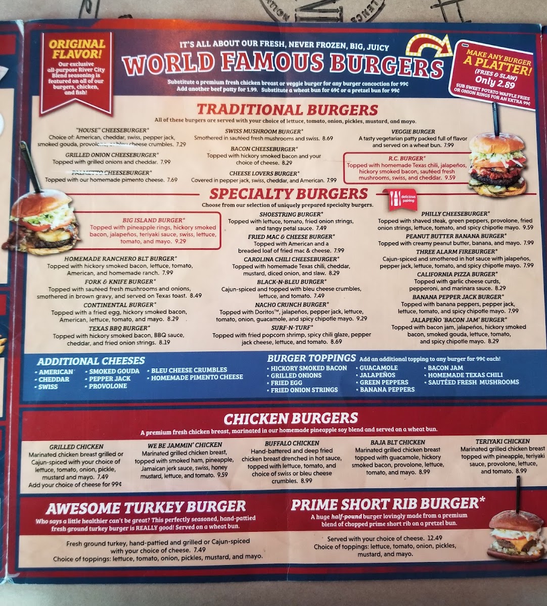 Burgers are served with choice of lettuce, tomato, onion, pickles, mustard, and mayo. Choice of American, smoked gouda, cheddar, swiss, pepper jack, provolone, or bleu cheese crumbles. Substitute a premium fresh chicken breast, turkey burger, or veggie burger for 99. Add another beef patty for 2.99.