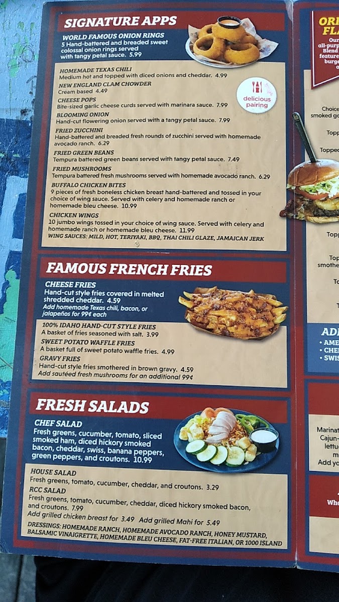 For salad lovers, the RCC Salad delivers freshness with crispy greens and hickory smoked bacon. Don't miss out on their famous fries, especially the Gravy Fries or Sweet Potato Fries.